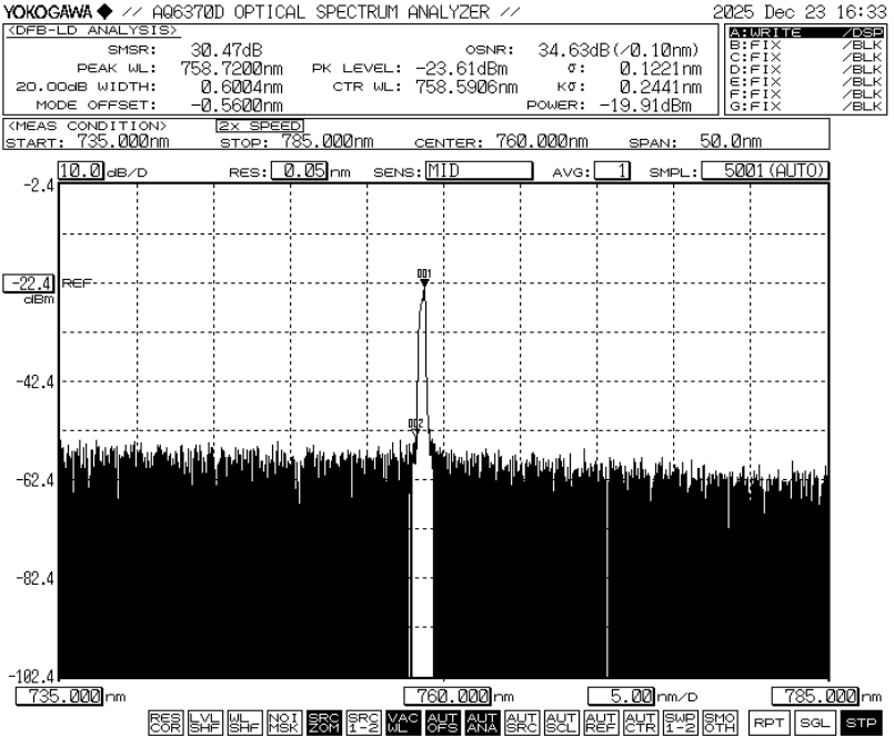 | Center bølgelængde | λc | TL=25℃ CW | 758 | 760 | 762 | nm |