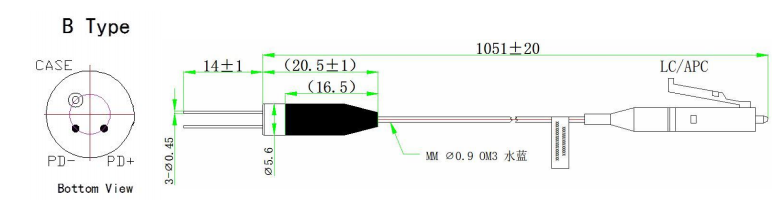 InGaAs Pigtailed fotodioder koblet multimode fiber, med en kernediameter på 50µm eller 62,5µm valgbar, og et detektionsbølgelængdeområde på 900-1700nm.