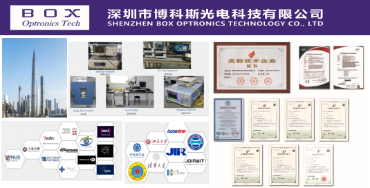 Shenzhen Box Optronics Technology Co., Ltd.(BOX Optronics Tech) er en højteknologisk virksomhed med speciale i fiberoptisk kommunikation og fiberoptisk sensing. Virksomheden er forpligtet til at give kunderne produkter og tjenester af højere kvalitet, hurtigere servicesvartider og hjælpe kunder med at skabe større værdi. Med stærke R&D-, produktions- og salgskapaciteter samt erfarne produktudviklingsingeniører kan virksomheden skræddersy personlige produkter efter forskellige kundebehov. I mange år har virksomheden været engageret i teknologisk innovation og løbende introduceret avancerede teknologier og talenter. Det har opnået kreditvirksomhed på AAA-niveau, teknologibaseret SMV og nationale højteknologiske virksomhedscertifikater og har med succes bestået ISO9001-kvalitetssystemcertificering, strengt overholdt systemkravene og strengt testet produktkvalitet.